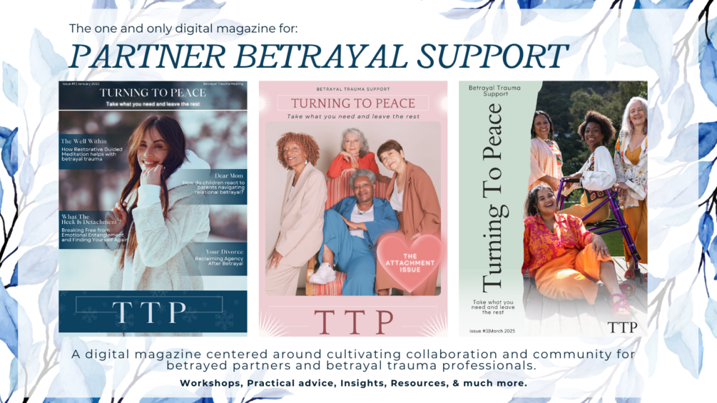 Discover a safe and empowering space with Turning to Peace, the discreet, affordable digital magazine designed to support individuals navigating betrayal trauma. Delivered on the 3rd Friday of every month, each issue is packed with expert insights, healing strategies, and stories of resilience to help you rebuild trust, confidence, and peace of mind.